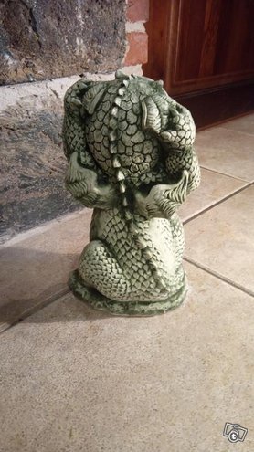 Pikku lohikäärme betonipatsas on patinoitu sammaleenvihreällä värillä. Patsas kestää Suomen vaihtelevat sääolosuhteet. Sopii myös hienosti sisätiloihin.