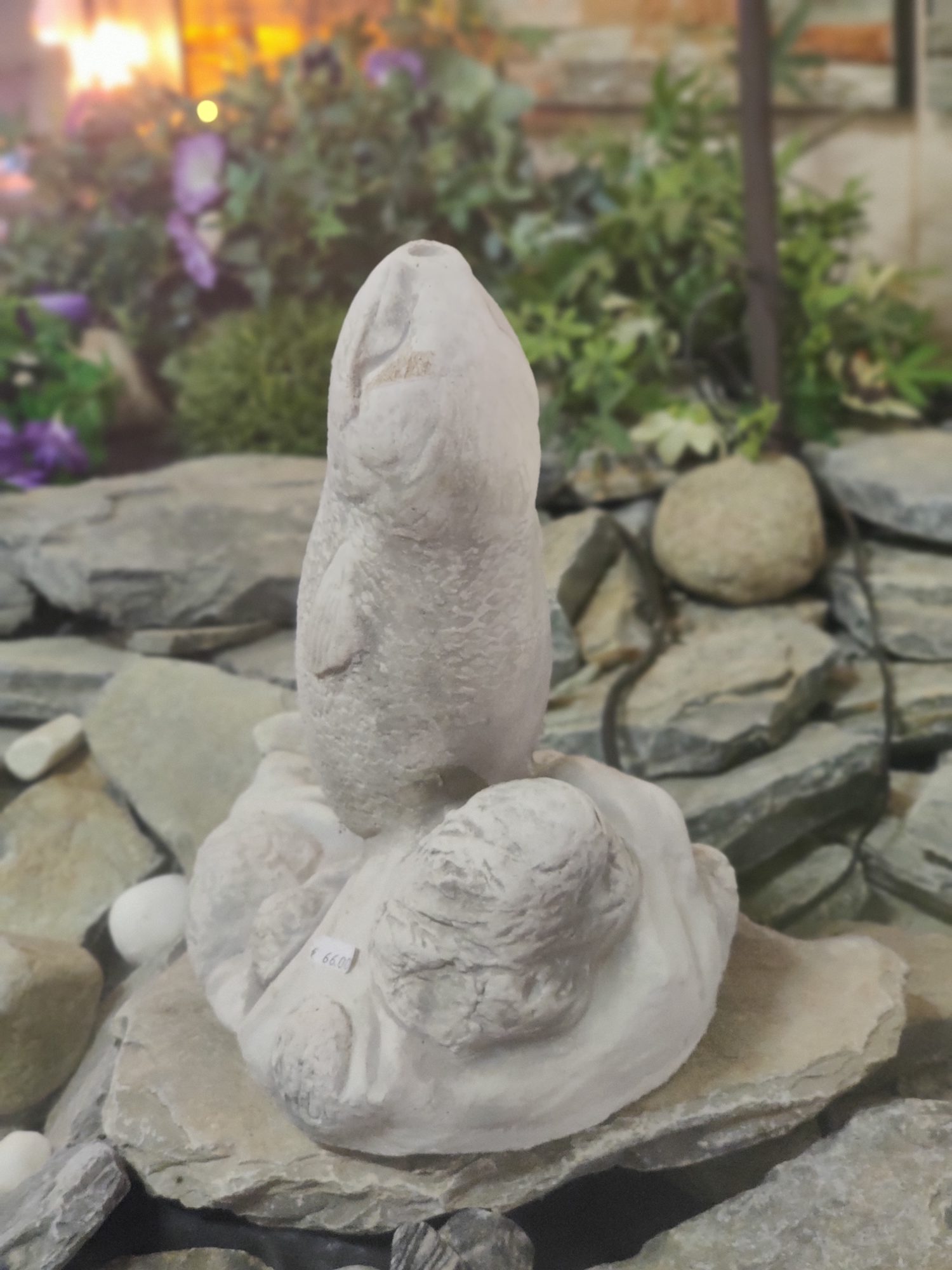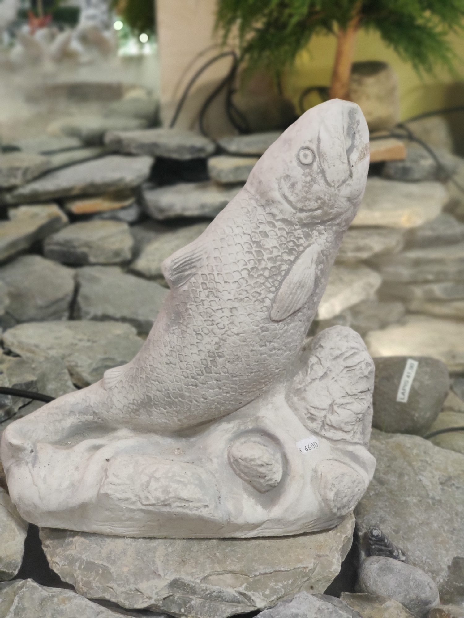 Eurooppalaisen betonipatsaiden valmistajan kaunis kalapatsas. Patsaan suussa on myös reikä, jolloin sitä voi käyttää myös suihkulähde patsaana. Betoni kestää Suomen vaihtelevan sään.